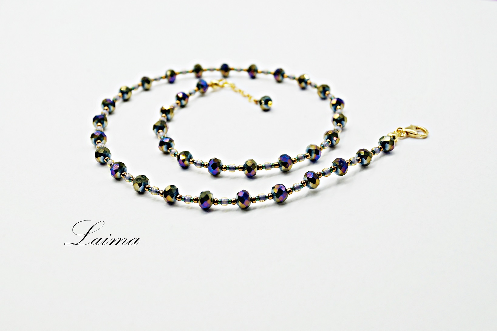 Materiale: Glassperler 6x5mm, 2,2mm, 1,8mm Låsen er av forgylt sølv 925